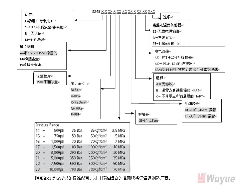 輸出,模擬:4-20mA(標準壓力,溫度可選) 輸出,數(shù)字:HART 綜合精度(錯誤)(20-100%滿量程): ±0.25%滿量程(3M和3M以上) +0.35%滿量程(1.5M和1.5以下) 溫度漂移(77-572℉,25-300℃):0.001%滿量程/℉,最大(0.001%滿量程/℃,最大) 重復(fù)性:±0.1%滿量程 爆破額定壓力:2X滿量程 超壓額定:1.5X滿量程 量程:1,500至10,000psi 可調(diào)范圍:6:1調(diào)節(jié)比,向下 負載電阻:250歐姆@18Vdc;500歐姆@23Vdc |