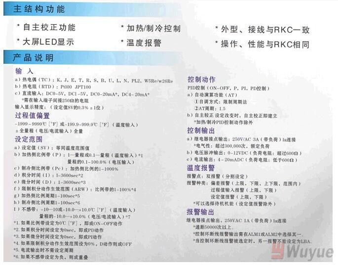 *自主校正功能*大屏LED顯示 *加熱/制冷控制*溫度報(bào)警*外型操作接線與RKC 一致*性能與RKC 相同